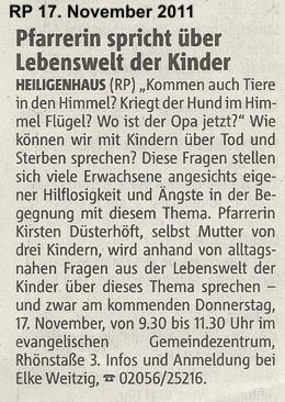 Pfarrerin spricht über Lebenswelt der Kinder (RP 17. November 2011)