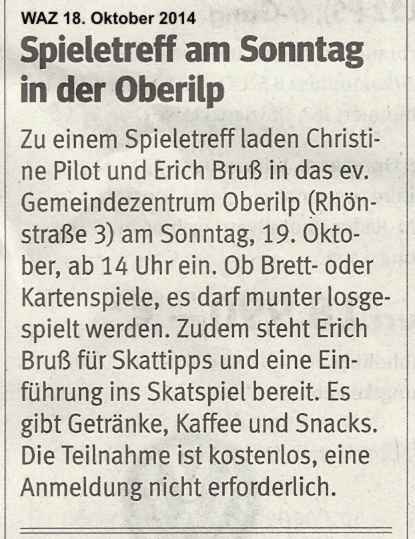 Spielenachmittag in der Oberilp fällt aus (WAZ 13. Dezember 2014)