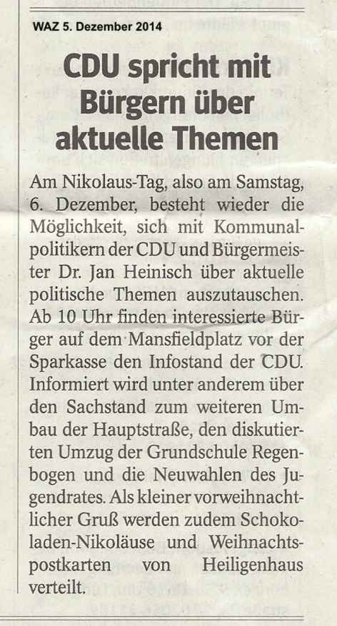 CDU spricht mit Bürgern über aktuelle Themen (WAZ 5. Dezember 2014)